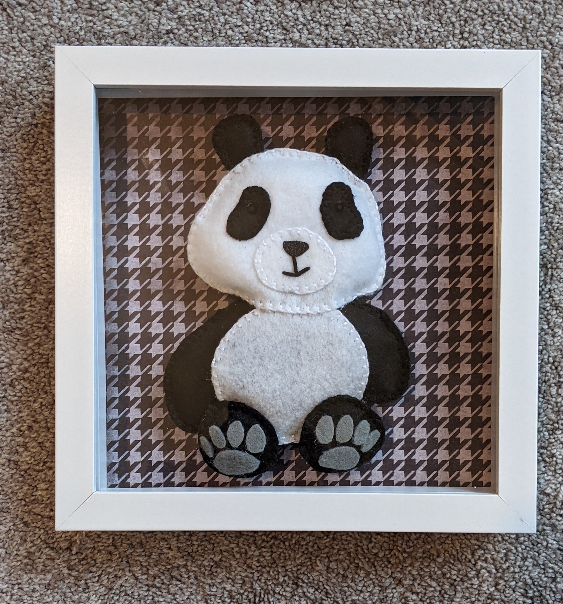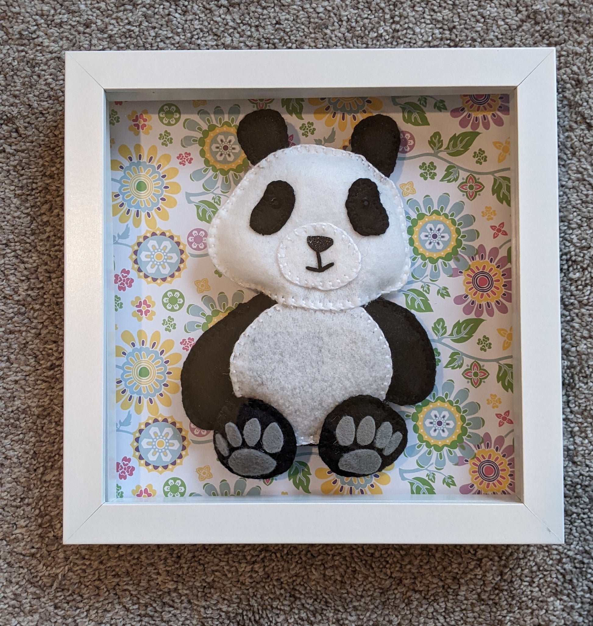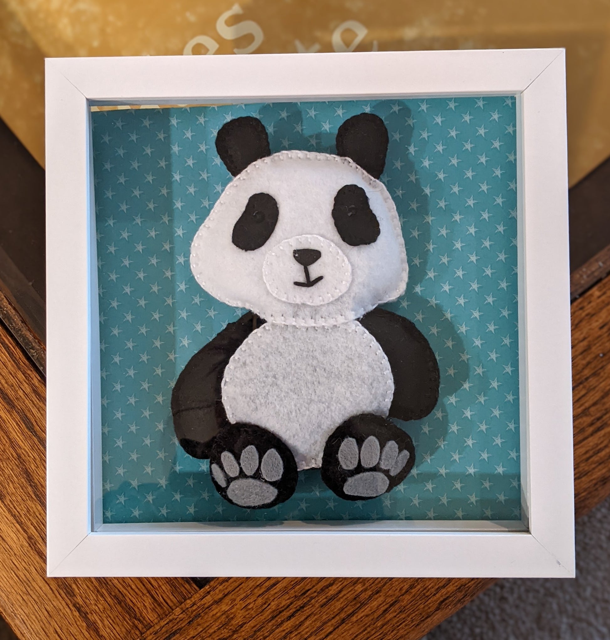"Bamboo" Billy Box — a gentle little scene in a keepsake 8" × 8" shadow box! This handcrafted piece features Bamboo, an irresistibly sweet felt panda with soft ivory and charcoal layers, tiny stitched details, and padded paws that seem ready for the warmest hug. Bamboo sits peacefully with a tender expression, capturing the quiet magic of a girl and her panda — a friendship built on comfort, imagination, and unconditional love. With his rounded ears, delicate paw pads, and softly sculpted face, Bamboo brings a sense of security, playtime adventures, and whispered bedtime secrets to any nursery or cozy corner.