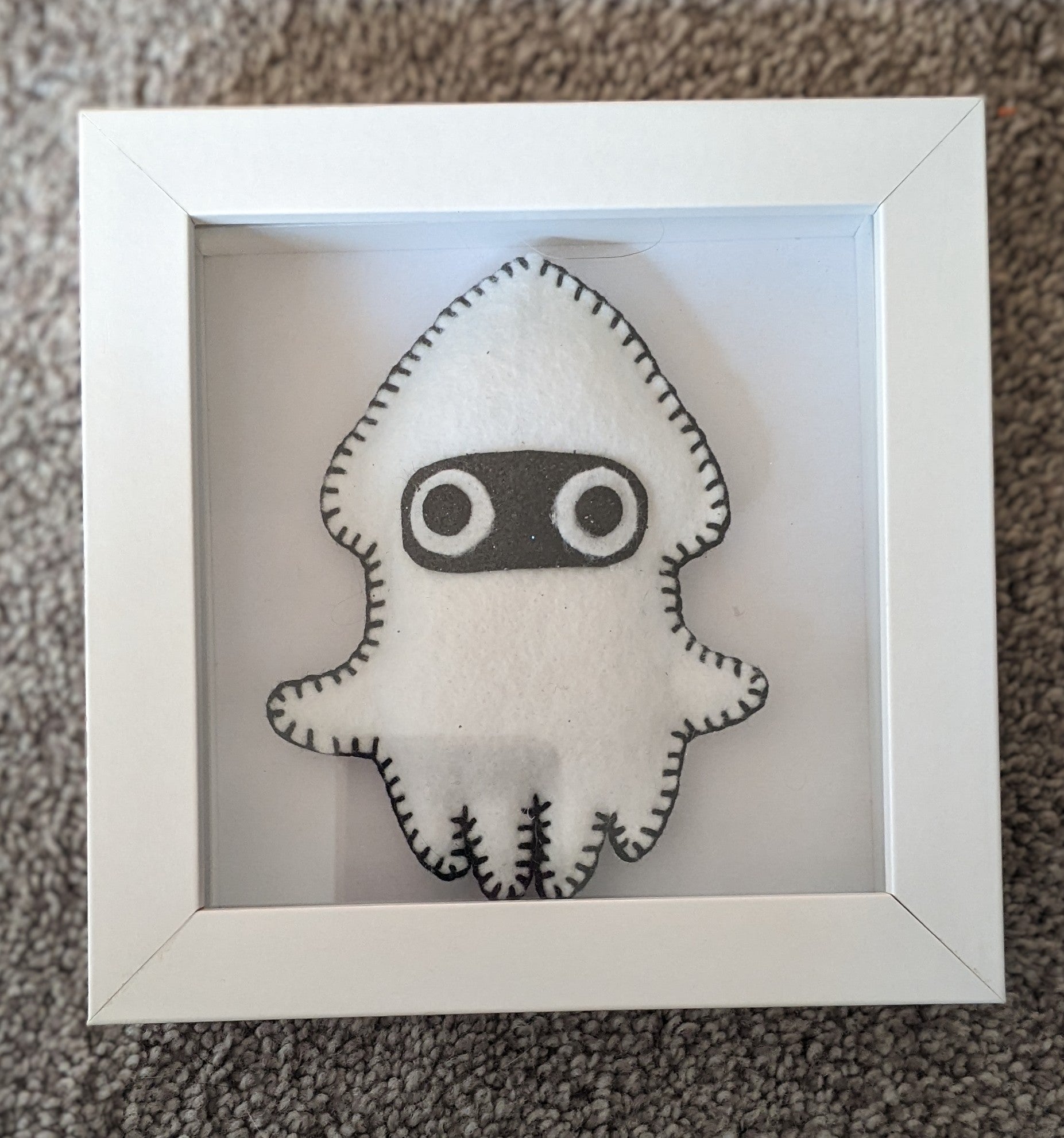 Blooper Billy Box — a playful little scene in a keepsake 5" × 5" shadow box! This handcrafted piece features Blooper, a felt design inspired by the quirky sea creature from the world of Mario Bros, bringing a splash of fun, nostalgia, and gamer charm to your nursery or collection. Made with a mix of new and repurposed materials, each Billy Box adds whimsy, storytelling, and a touch of video game magic to any space.