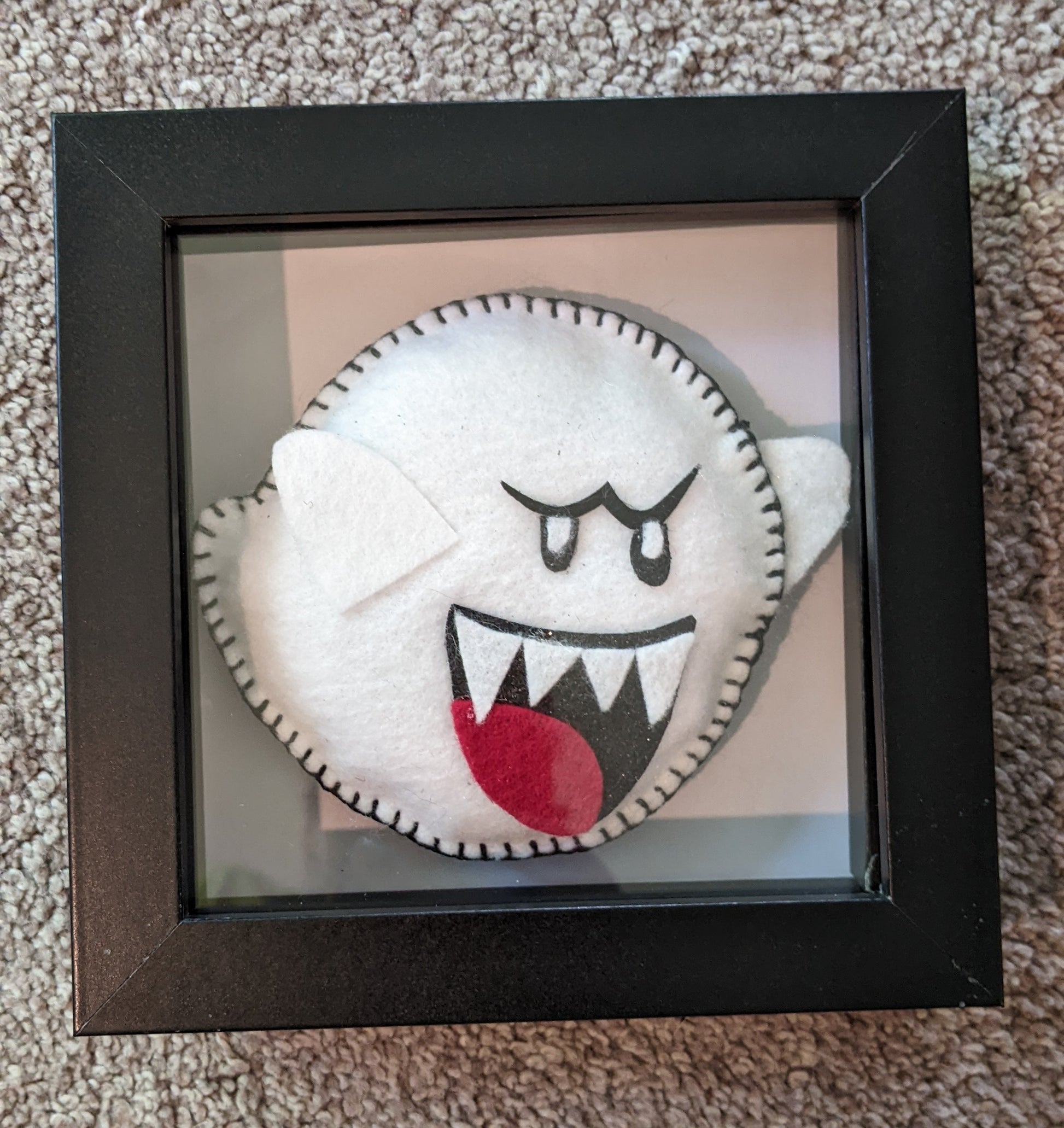 Boo Billy Box — a playful little scene in a keepsake 5" × 5" shadow box! This handcrafted piece features Boo, a felt design inspired by the mischievous ghost from the world of Nintendo, bringing a hauntingly fun touch of nostalgia, charm, and gamer spirit to your nursery or collection. Made with a mix of new and repurposed materials, each Billy Box adds whimsy, storytelling, and a playful nod to classic video game adventures.