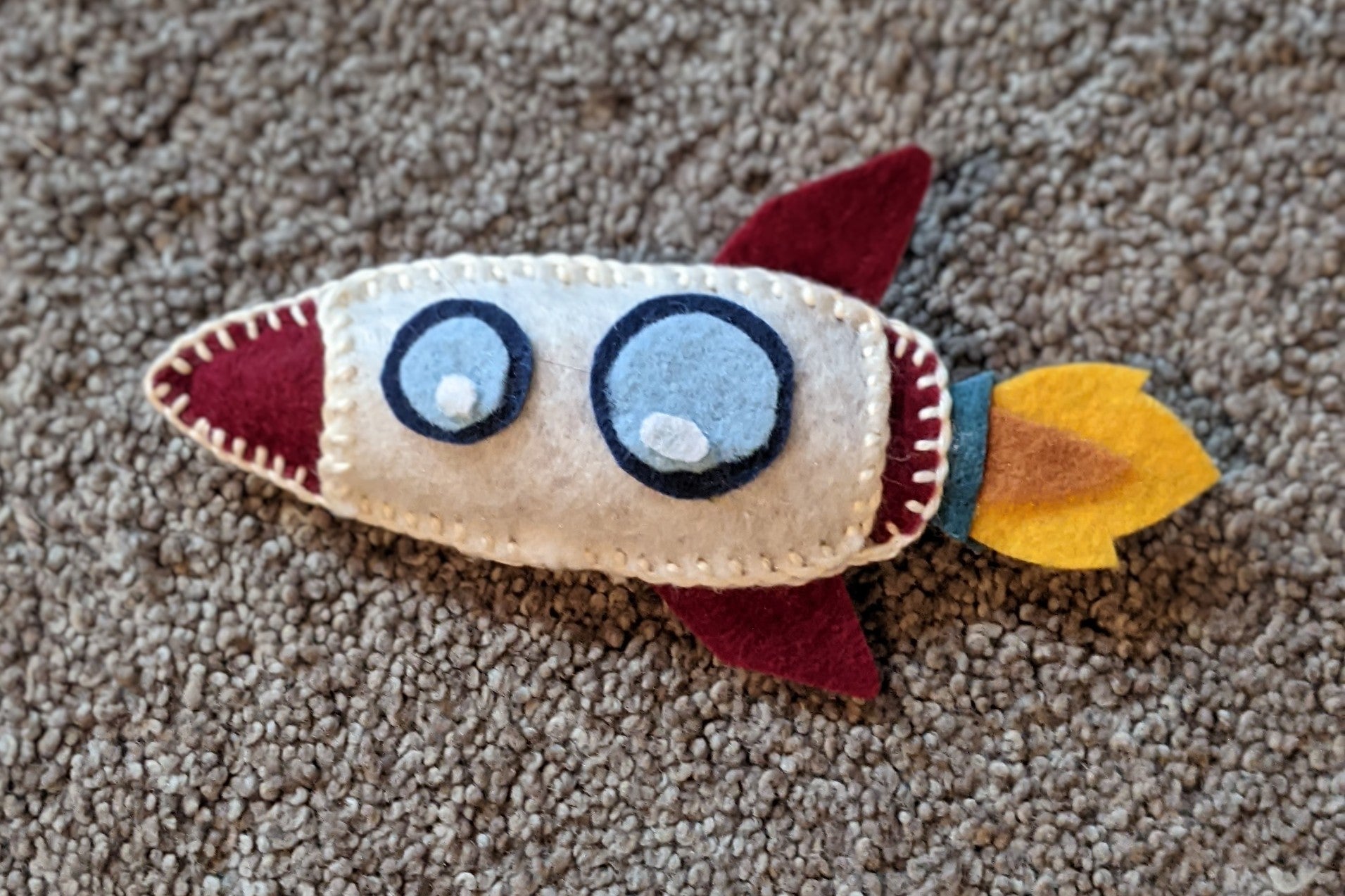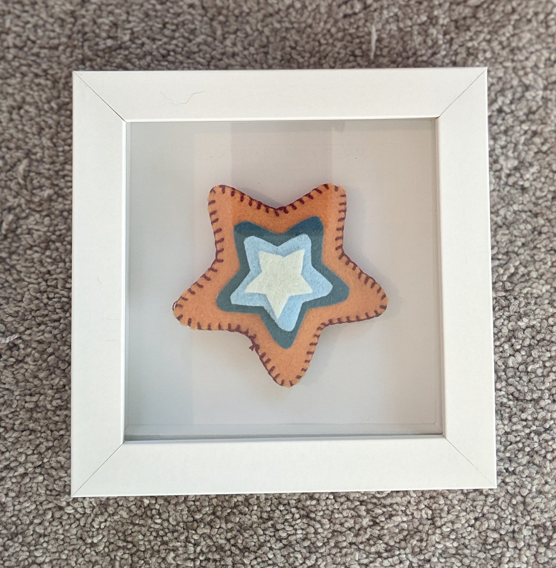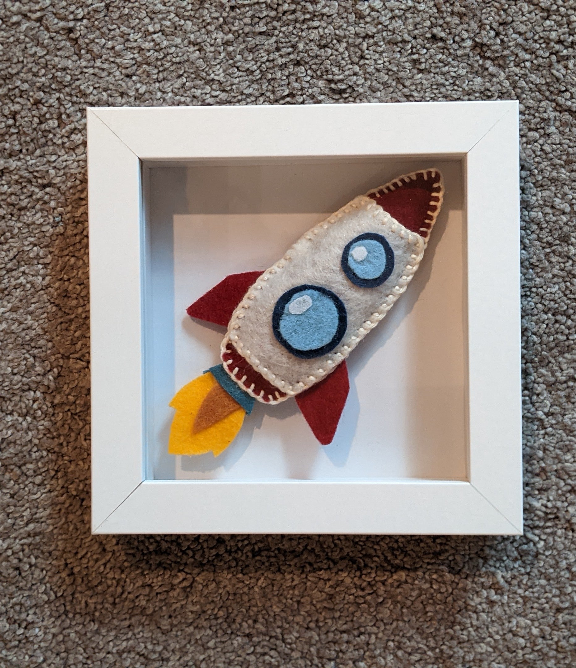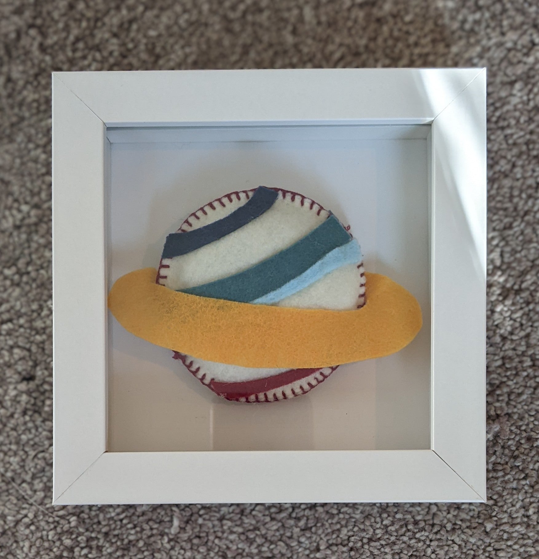 Little Dippers Billy Box — a whimsical little scene in a keepsake 5" × 5" shadow box! This handcrafted piece features Little Dippers, a playful trio of felt creations inspired by the wonder of space — a striped planet with a golden ring, a layered star bursting with cozy colors, and a cheerful rocket ship ready to zoom among the constellations. Made with a mix of new and repurposed materials, each Billy Box adds a spark of imagination, storytelling, and nostalgic comfort to any space.